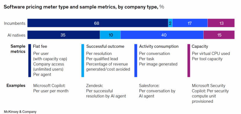 Across the market, existing software products are getting AI capabilities — often with higher price tags attached. McKinsey estimates that AI functionality can drive list price increases of 60%–80% in some categories, particularly in customer service, analytics and CRM.