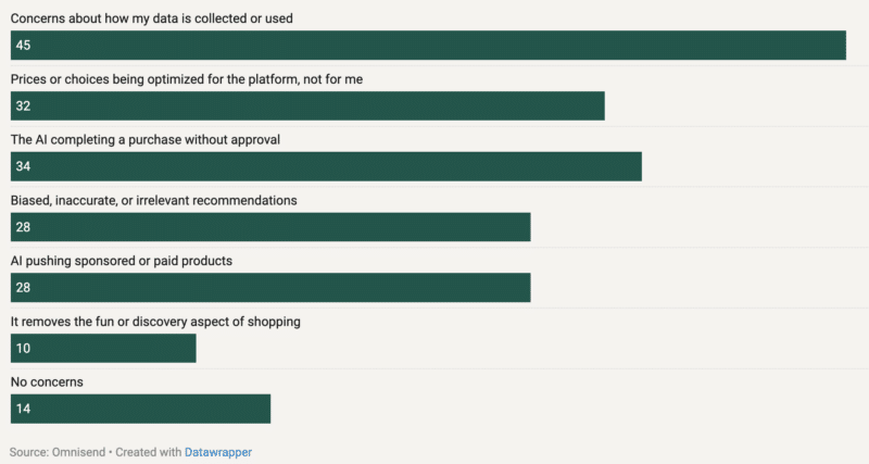 Control is another pressure point. Thirty-four percent of shoppers are uncomfortable with AI completing purchases without approval, and 45% are uneasy about how their data is collected and used.