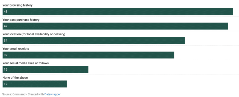 To improve recommendations, 43% of U.S. shoppers say they will share their browsing history, 42% their past purchase history and 34% their location, according to Omnisend’s “AI Shopping Report.” That’s a meaningful level of openness, but it comes with clear expectations about the use of the data.