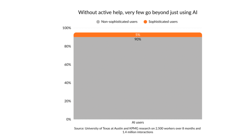 They found that, although 90% of the 2,500 employees studied use AI, only 5% fit the researchers’ definition of “highly sophisticated.” These sophisticated users demonstrated their capabilities through behaviors that can be taught and advocated:
